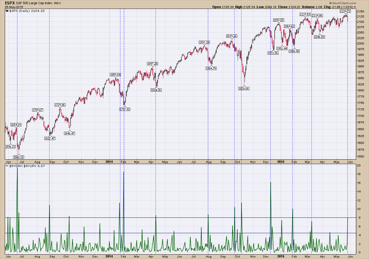 Today was an ugly day in the markets as stocks dropped, volatility gapped 16% higher and bonds had one of their best days in a long time. While there are some very disconcerting fundamentals underneath the hood of the US stock market, to put this day in perspective we are only off 1.3% from all-time highs. But because this is the Jason Bourne market (always an eye on the exit) every time these days occur I check my indicator charts to see if they can give me any insight. One indicator I like to look at first is what I call “volume capitulation” which have presented below. Simply, it tries to identify bottoms during short term corrections by analyzing selling volume. What you see is that at or near the end of a correction everyone that wanted to sell did so (capitulation) and as such the market reasserts back into its uptrend. By looking at volume and selling patterns you can recognize the signs of capitulation. In the upper of pane of the chart is the price of my proxy for the US stock market, the SP500. In the bottom pane is the result of dividing the volume of shares on the NYSE that traded lower by the volume of shares of stocks that traded higher. Logically you would expect on days of capitulatory selling this ratio would be large. In fact that is exactly what happened today as there was more than 8x the down volume as up. What makes this number interesting is that in the past when this ratio has gotten above 8 (I have highlighted these occurrences with blue dashed vertical lines) it has been a pretty good indicator of exhaustion selling and that a bottom was near. While it is not perfect in picking THE bottom (it turns out to be early in most cases), it does provide a nice early warning that a bottom is likely just around the corner. Will this time be any different?